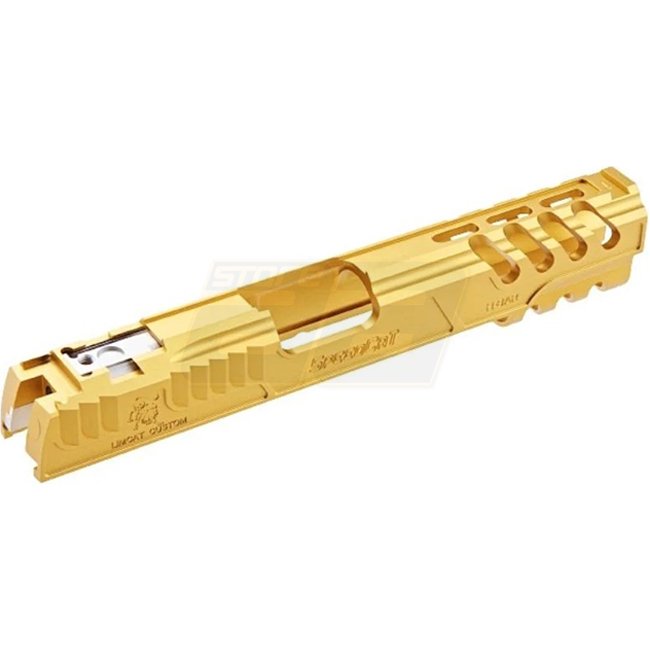 The 5KU Speed Cat Aluminium Slide - Gold is a stylish and lightweight slide set for Marui Hi-Capa / 1911 GBB pistols, ideal for competition and speed-builds.