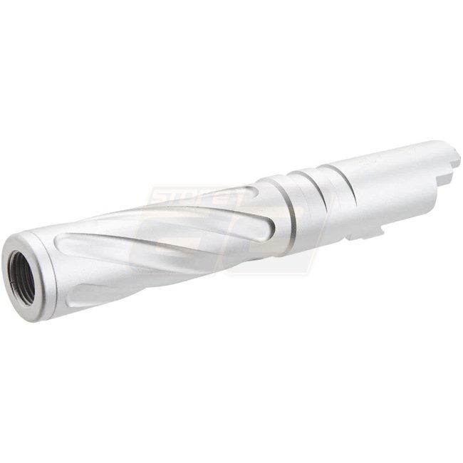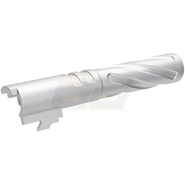 The 5KU Marui Hi-Capa 4.3 GBB Outer Barrel Tornado Aluminium - Silver is a lightweight aluminum outer barrel for Marui Hi-Capa 4.3 series gas Airsoft pistols. Features internal 11mm CW thread for adding accessories.
