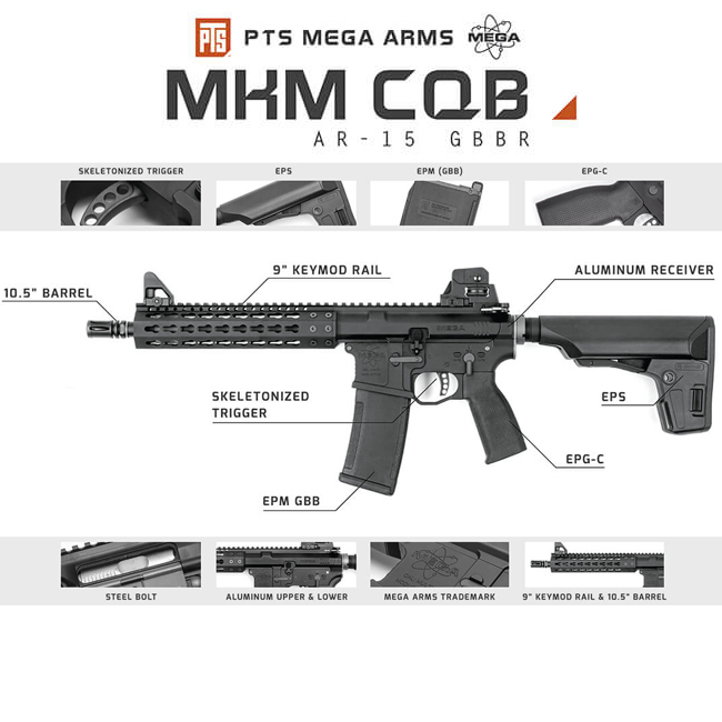 The PTS Mega Arms MKM CQB GBBR replicates the unique design of the Mega Arms MKM AR-15 platform. The Mega Arms MKM platform mates the rail with the billet receiver in a proprietary manner that makes it as rigid and sturdy as a monolithic (1 piece) upper yet remains extremely lightweight. This design, combined with PTS’s precision engineering and faithfulness to realism, makes this a very high quality and durable airsoft replica.