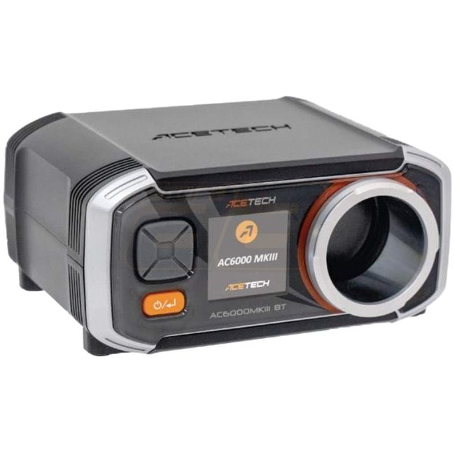 ACETech AC6000 MKIII Chronograph - Velocity: 30 m/s ~ 400 m/s, Rate of fire: 100~5000 rpm, Display: 128x64 pixel illuminated LCD screen, Power: Micro-USB input or 2x AAA battery, Mounting: Tripod-ready, Weight: 284g, Size: 130 x 108 x 61 mm