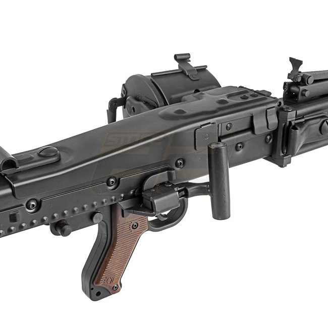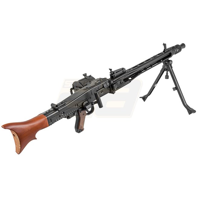 Highly realistic AGM MG42 AEG with custom gearbox, short type motor, metal and wood construction, and 2400 round magazine capacity. Impressive 1235mm length and 6835g weight. Features 600mm inner barrel, adjustable hop-up, and shoots at 320-340 FPS. Perfe