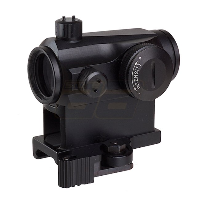 Aim-O T1 Red & Green Dot Sight with QD High Mount in Black. Magnification: 1x, Lens diameter: 20mm, Illumination: Red & Green, Reticle: Dot, windage & elevation adjustable, Uses 1x CR1632 battery, Mount: 20mm (Picatinny), Length: 65mm.