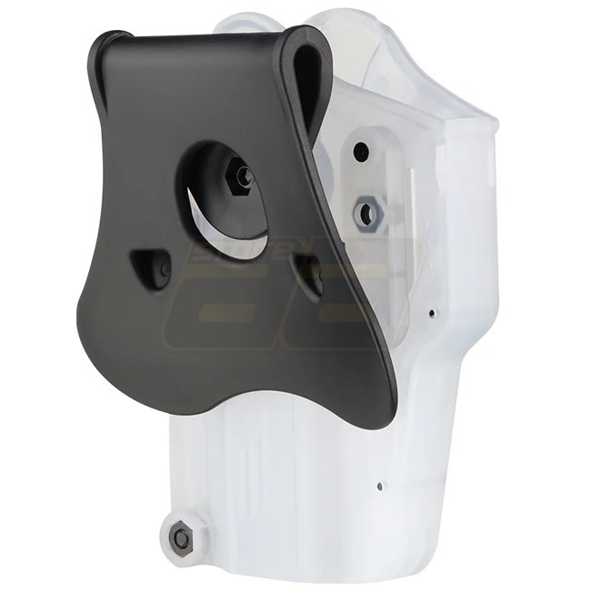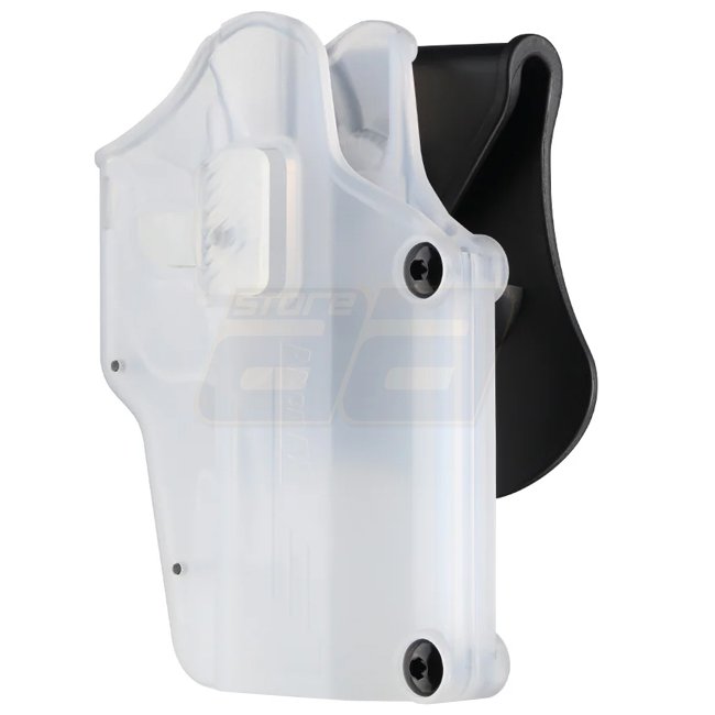 The Amomax Universal Paddle Holster is a stylish and functional holster designed for airsoft players. Its transparent design adds a unique touch, while the durable polymer construction and right-hand orientation ensure reliable performance and quick access during fast-paced airsoft games.