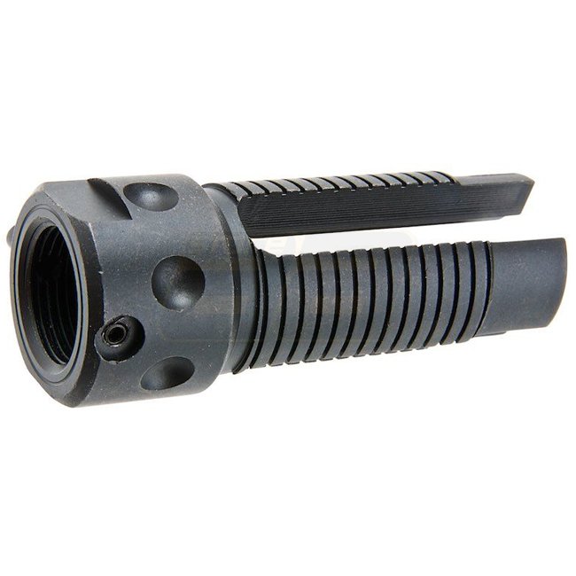 Enhance your airsoft rifle's look and performance with the Angry Gun QDC 3-Prong Flash Hider. Compatible with the Angry Gun QDC/MCQ Dummy Suppressor, this steel flash hider measures 55mm in length, weighs 66g, and features a 14mm CW thread.