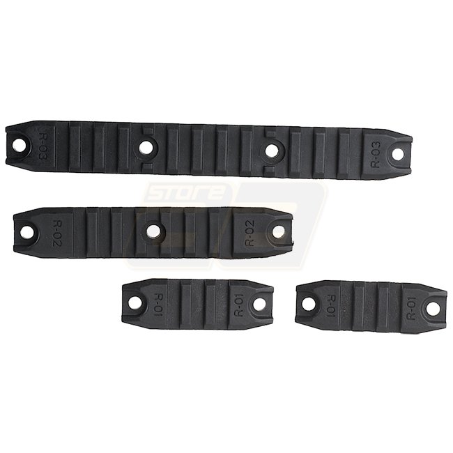 Sleek black Ares M4 Rail Set compatible with ARES Amoeba AM-013, AM-014 and AM-015 AEG models. Made of durable reinforced polymer, set includes 2x 63mm x 22mm, 1x 115mm x 22mm, and 1x 167mm x 22mm Ares Rails.