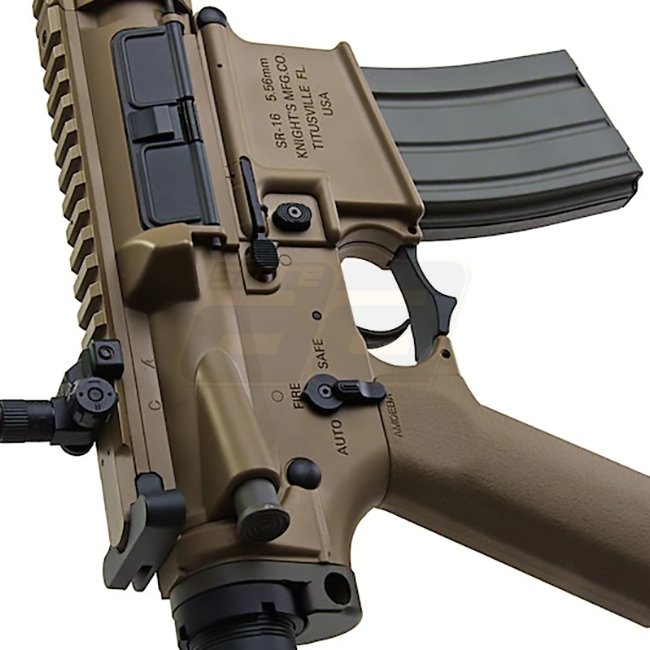 Ares SR16 AEG Long - Tan is a high-quality airsoft rifle featuring a version 2 gearbox, MOSFET, long type motor, and a durable metal build with polymer stock and pistol grip. It has a magazine capacity of 330 rounds, a length of 700mm, and weighs 2120g. T