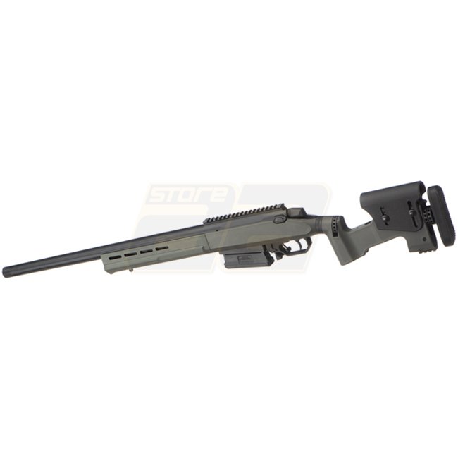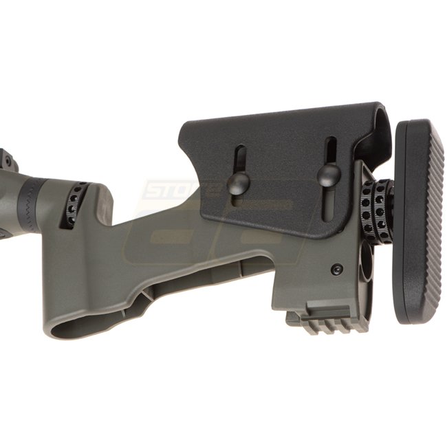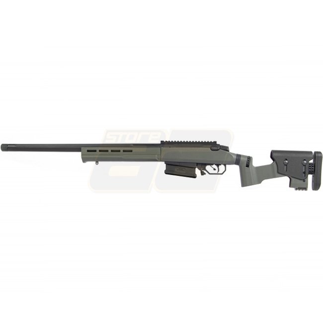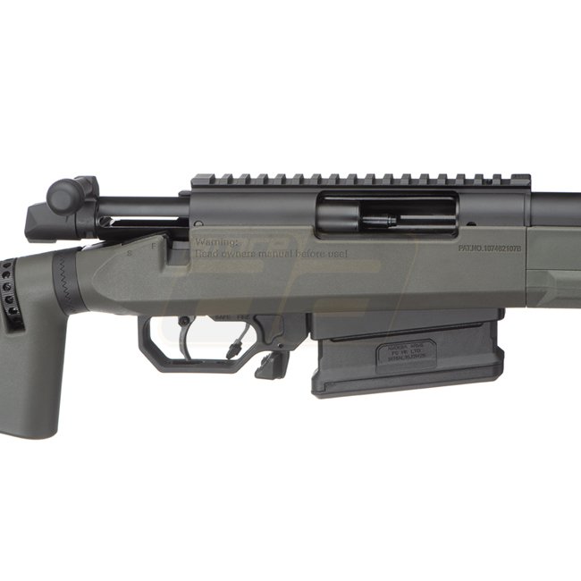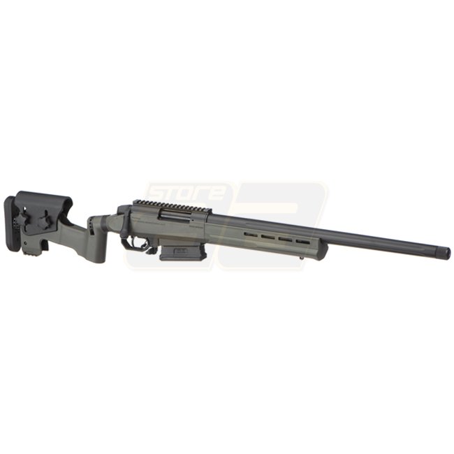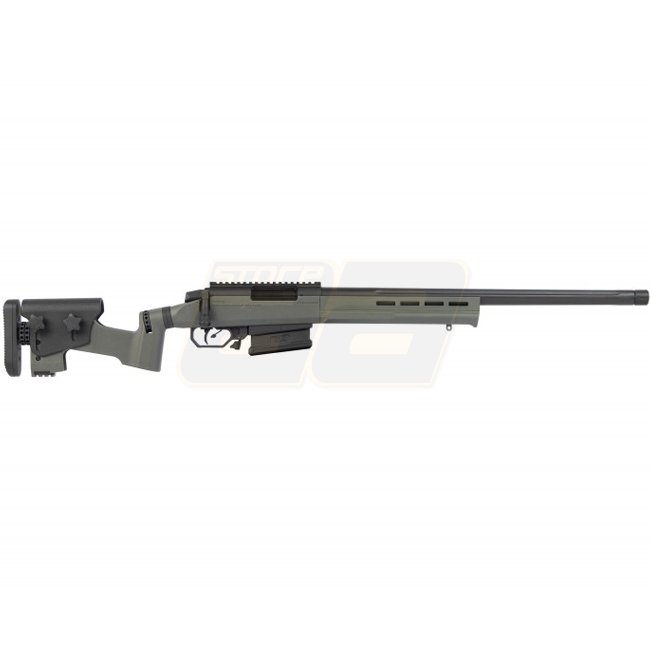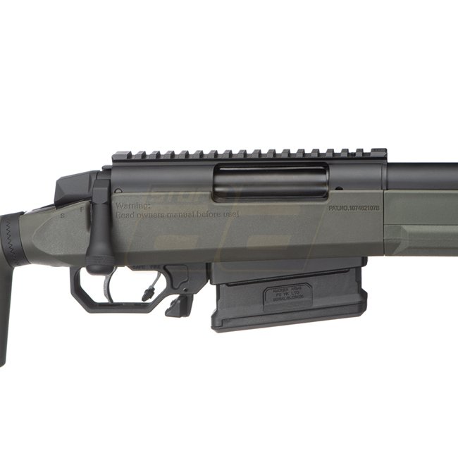 Ares Striker AST-01 Spring Sniper Rifle in Olive color. Metal and polymer construction, 45-round magazine capacity, 1070mm length, 3000g weight. Shoots 410-430 FPS with adjustable Hop Up for precise targeting. Perfect for long-range single shot shooting u