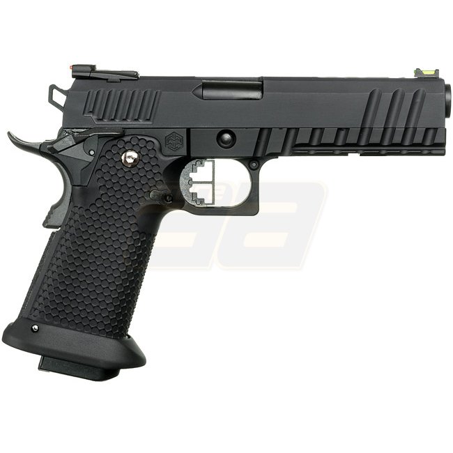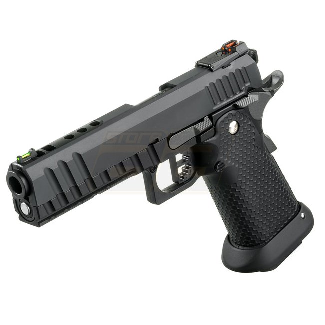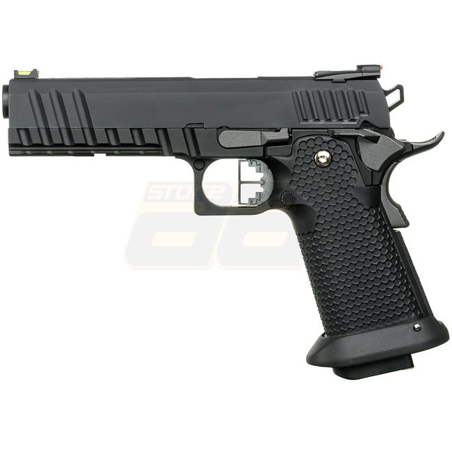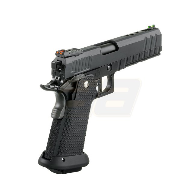 Armorer Works HX2003 5.1 Hybrid Gas Pistol in Stealth Black color. Metal slide with plastic grip, 30-round magazine capacity, 223mm length. Weighs 1070g, with an inner barrel length of 105mm. Muzzle velocity of 280-300 FPS. Semi-auto shooting mode with a