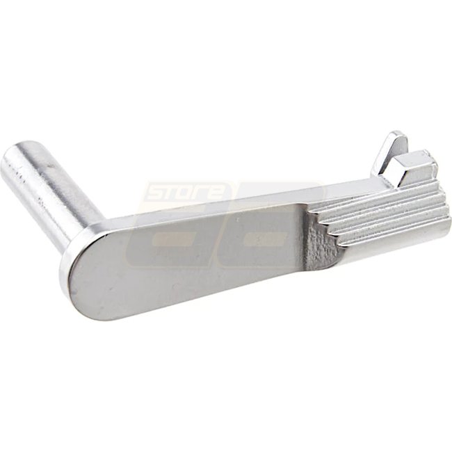 Upgrade your airsoft gun with the Armorer Works HX Marui / WE / AW Slide Stop in sleek silver finish for enhanced performance and style.