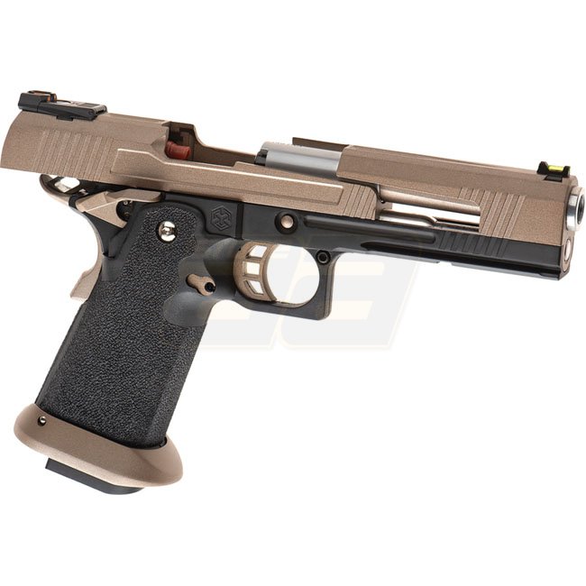 Armorer Works HX1033 Split Slide Full Auto Gas Blow Back Pistol. Metal/polymer construction, 30 round magazine, 223mm length, 1100g weight, 110mm inner barrel, 320-340 FPS velocity, Semi Auto & Full Auto modes, shooting range of 43.90-46.65m, adjustable h