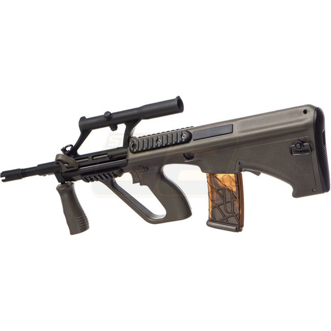 Compact and powerful AUG A1 airsoft gun in olive color. Metal gearbox and short type motor ensure high performance. Semi & full auto shooting modes with adjustable hop-up. Perfect for intense battles.