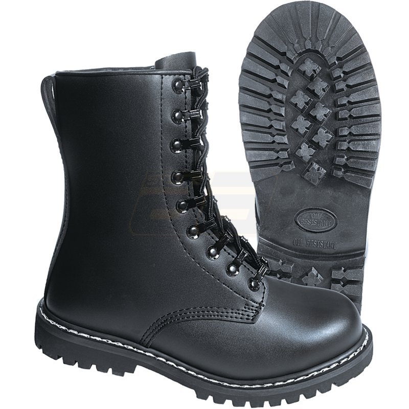 Brandit Combat Boots Para - Black - 40. Resistant leather. Oil resistant grip sole. 9-whole lacing. Steelcap. Material outside: 100% real leather. Inside: 100% real leather. Sole: rubber.