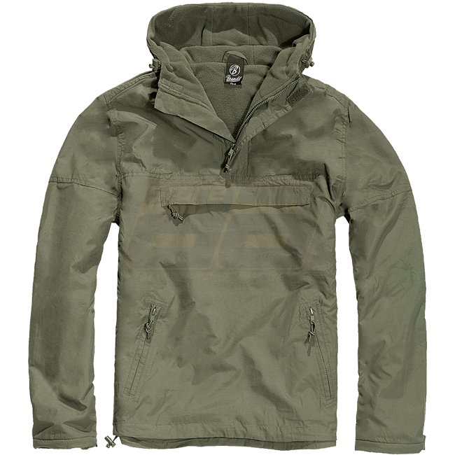 Stay protected from the elements with the Brandit Windbreaker in Olive - M. Wind- and water-repellent with fleece lining, side zipper, velcro cuffs, and zip pockets. Made of 100% polyester with lining also 100% polyester. Elastic strings are 80% elastodie