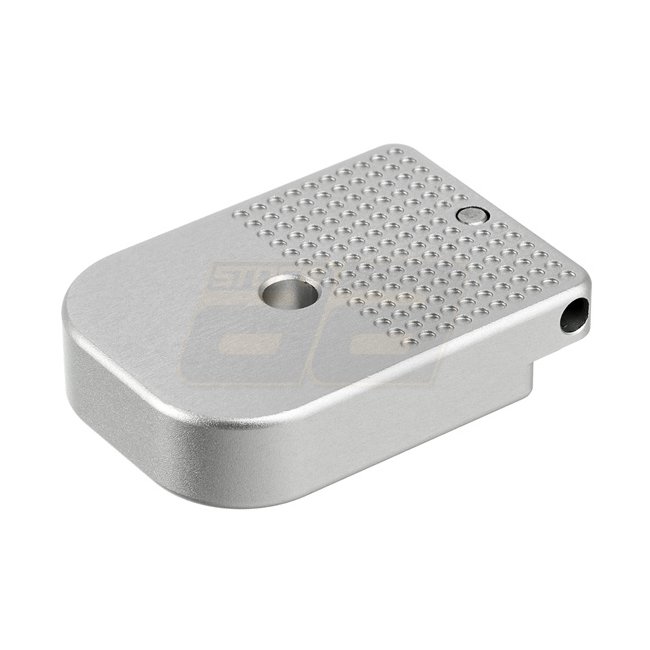 CowCow Marui Hi-Capa D01 Dottac Magazine Base - Silver: Machined aluminum construction, anodized finish, stainless locking pin for security, 10x14 dimple array for customization, compatible with Marui Hi-Capa magazines.