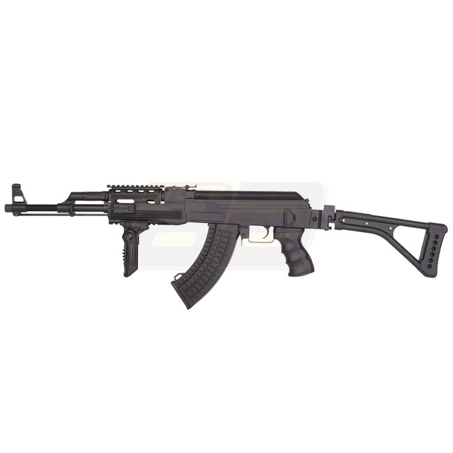 CYMA AK Tactical FS Full Metal AEG is a powerful airsoft rifle with a metal gearbox, short type motor, and a 550-round magazine capacity. Ideal for both semi-auto and full-auto shooting modes. Adjustable hop-up for precision aiming. Comes with a small typ