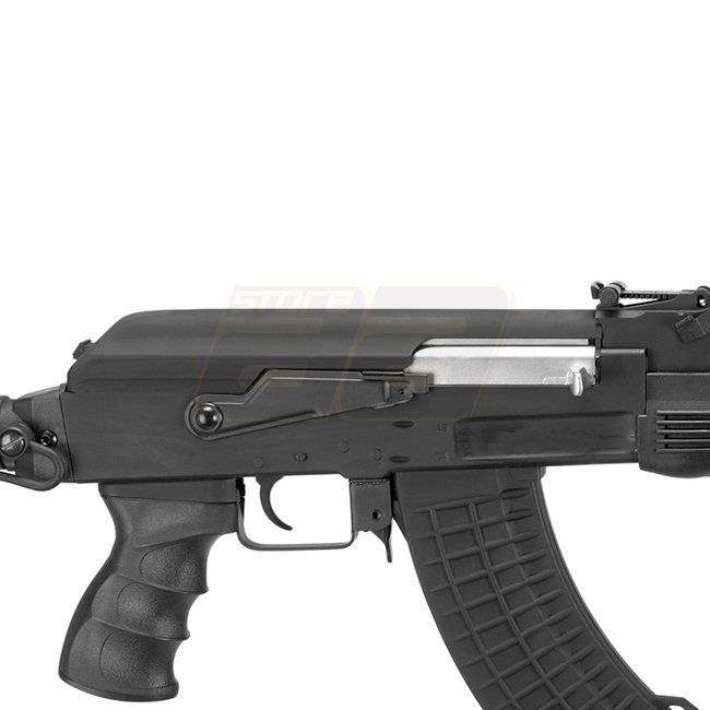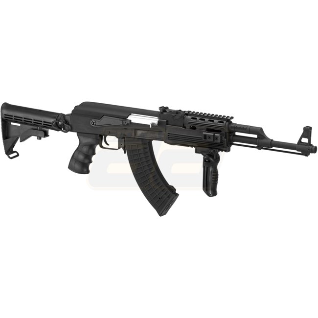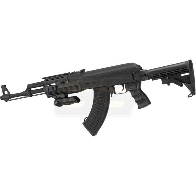 Cyma AK47 Tactical CM028C AEG with Version 3 gearbox, Long Type motor, shooting range up to 54.19m, and adjustable Hop Up. Comes with 400-round magazine and mini Tamiya plug battery.
