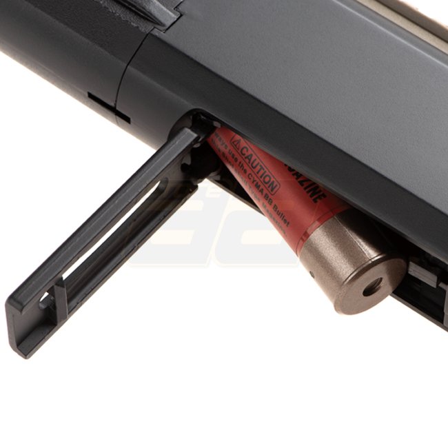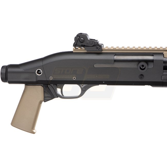The Cyma CM367 3-Shot Shotgun in Tan color is a high-quality airsoft shotgun featuring ABS plastic construction. It has a magazine capacity of 30 rounds (6mm), a length of 650mm, and a weight of 1300g. The inner barrel length is 300mm, and the muzzle velo