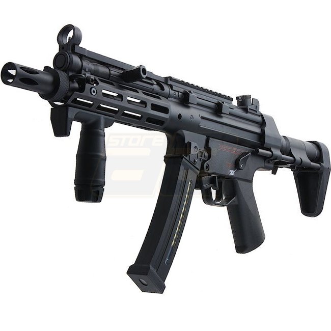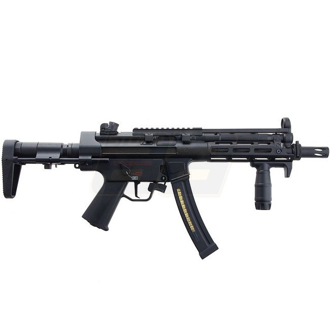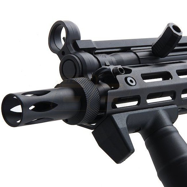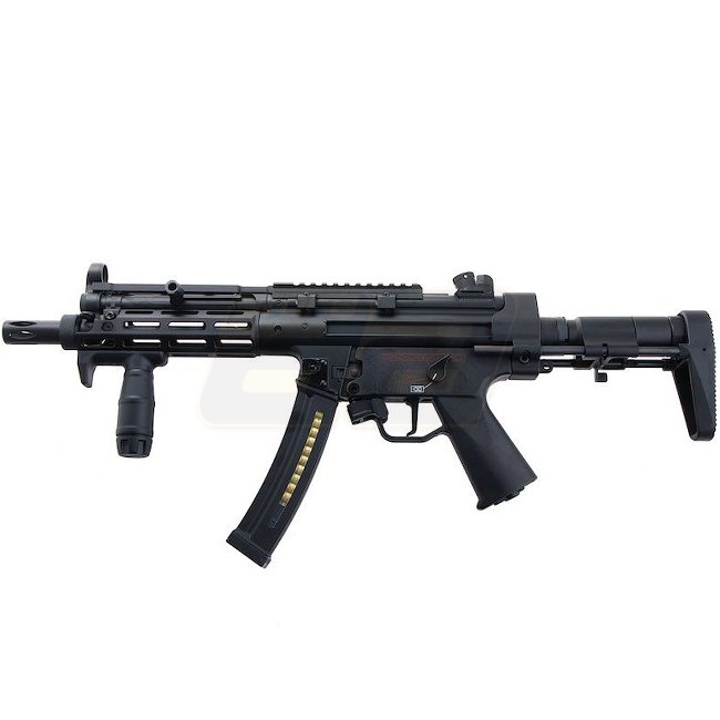 Cyma PM5G CM041G Platinum AEG is a versatile airsoft rifle with a metal gearbox, MOSFET, and long type motor. It features a magazine capacity of 130, a length of 615/710 mm, and a weight of 3400 g. The inner barrel length is 109mm, with a muzzle thread of