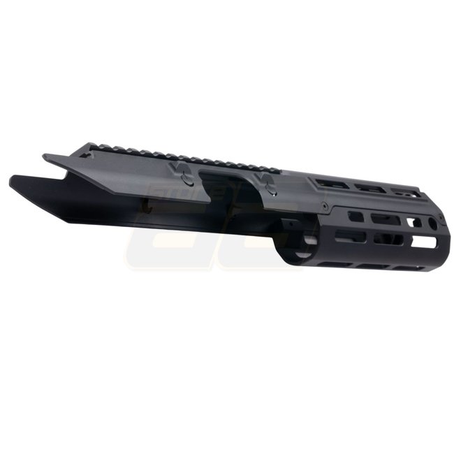 Die Picatinny-Schiene bietet eine durchgehende 1913-Schnittstelle zur Montage von Optiken, Visieren oder anderem taktischen Zubehör und ist aus leichtem Aluminium CNC-gefräst. Durch das flache Profil bleibt die klassische Linienführung des MP5 weitgehend erhalten, während gleichzeitig eine solide Plattform für moderne Zielhilfen geschaffen wird.