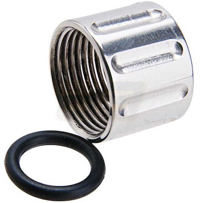 Dieser 5KU vertikale Riefen-gewindeschützer 14mm CCW in stilvollem silbernen Farbton bietet zusätzlichen Schutz für den Lauf Ihrer Airsoft-Waffe und verleiht Ihrer Ausrüstung einen Hauch von Raffinesse.