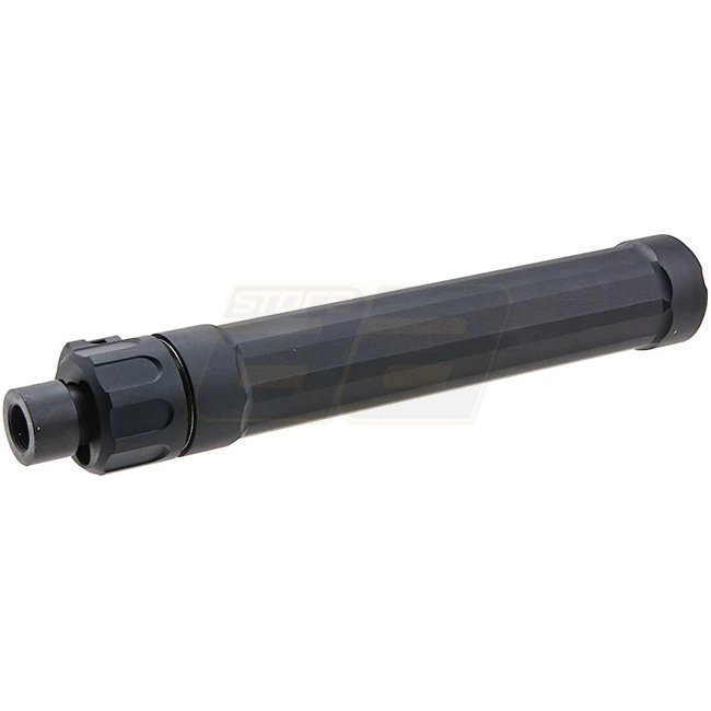 Der 5KU Ryder9 Suppressor ist eine robuste Schalldämpfer Attrappe aus Metall, die mit Airsoft Maschinenpistolen der WE MP5-Serie kompatibel ist. Wird mit einem passenden Feuerscheindämpfer geliefert.
