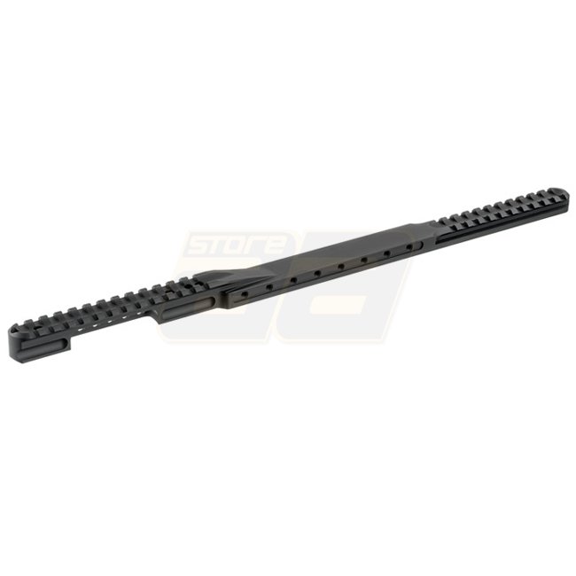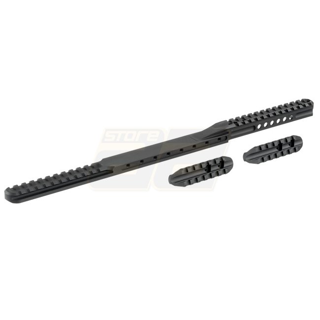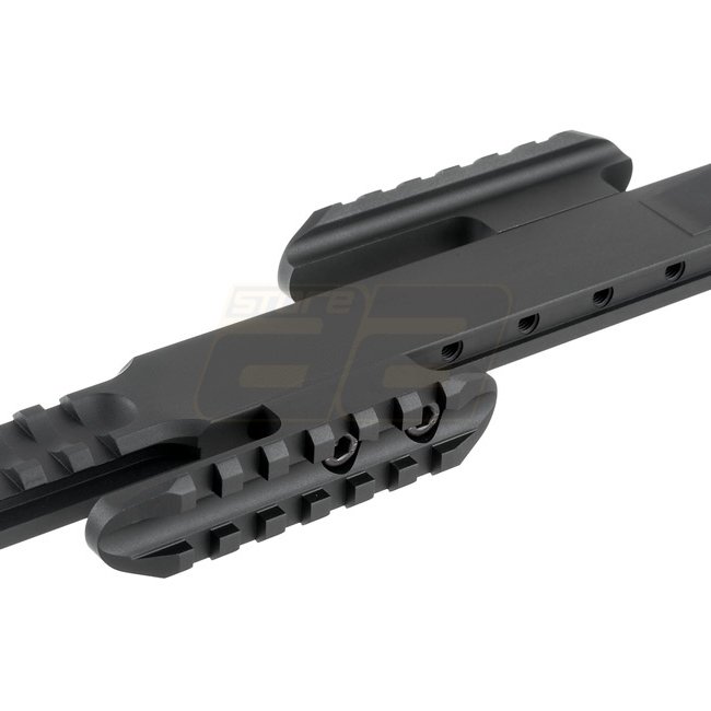 Bearbeitete Aluminiumkonstruktion lange Zielfernrohrschiene mit unterem vorderen Abschnitt für zusätzliche Zubehörteile. Enthält zwei modulare Seitenleisten. Kompatibel mit KJW M700 und Marui VSR-10.