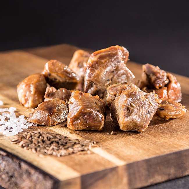 Du brauchst keine Extras, kein Chi-Chi, keine unnötigen Zusätze. Du brauchst nur Fleisch! Dampfgegartes Schweinefleisch mit Kümmel – saftig und aromatisch. Sein geringes Gewicht und der hohe Nährwert machen es außerdem zum perfekten Proviant für Wanderer, Biker und Abenteurer mit leichtem Gepäck.