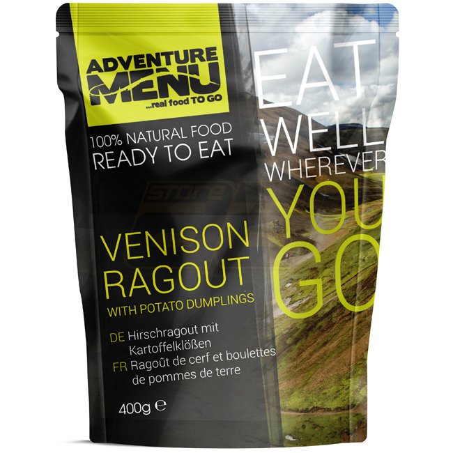 Inhalt: Hirschfleisch (30%), Kartoffelklöße (28%) (Kartoffeln, Weizenmehl, Weizengrieß, Ei, Salz) Wurzelgemüse (Karotten, Sellerie, Petersilie), Rotwein, Rapsöl, Speck, Tomatenmark (Wassečr, Tomatenpüree, Salz),Zucker, Weizenmehl, Zitrone, Johannisbeerkonfitüre (Korinthen, Zucker, Pektin), Zucker, Salz, Wildgewürz