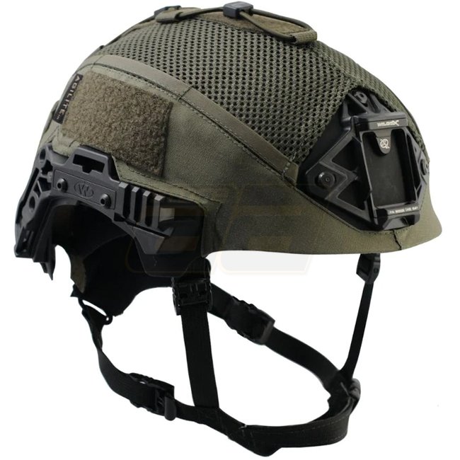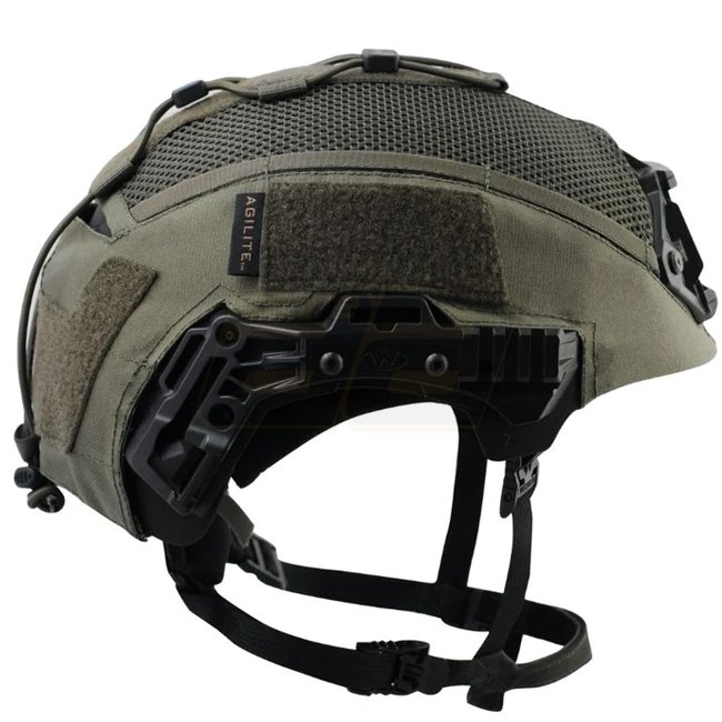 Die Agilite Team Wendy Exfil Carbon Helmet Cover in Ranger Green bietet eine präzise Passform und vielseitige Funktionen für Ihren Helm, einschließlich hinterer Schlaufen für AA- und CR123-NVG-Batterien, lasergeschnittene Polymer-Bungee-Kanäle, integriert