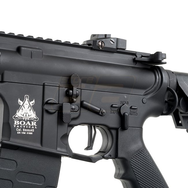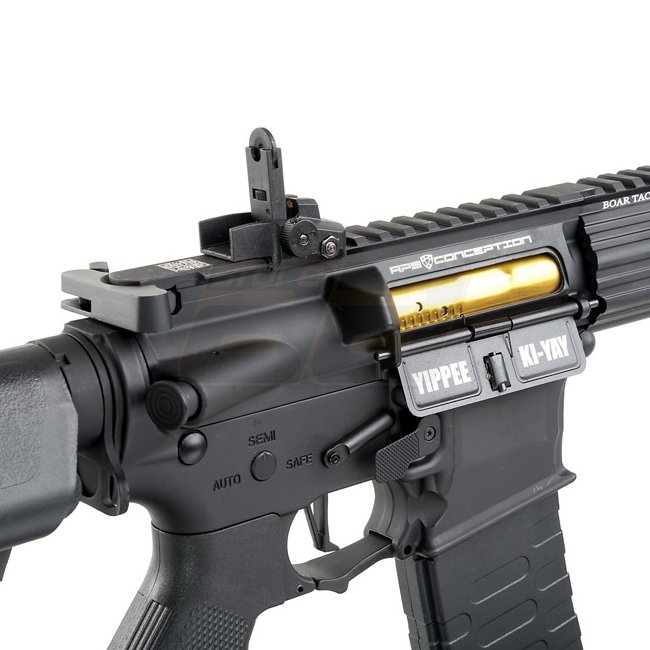 APS ASR117 BOAR Verteidigung Ambi Gewehr Taktik AEG - Version 2, Blowback-Getriebe, langer Motor, Aluminium-Konstruktion mit Polymer-Schaft und -Griff. 5300 (6mm) Magazin Kapazität, 814-896mm Länge, 2860g Gewicht, 420mm Innenlauf, 14mm- CCW Mündungsgewind