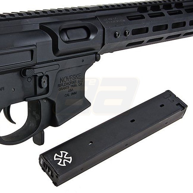 Das EMG Noveske 9 ist ein 9mm-Stil M4/AR-Plattform PCC (Pistol Calibre Carbine), das in einem sehr kompakten und leistungsstarken Paket geliefert wird. Die Waffe verfügt über einen M-LOK kompatiblen Handschutz mit einer Picatinny Schiene oben, die eine einfache Montage von Zubehör ermöglicht. Als zusätzlichen Bonus verfügt die Noveske 9 auch über ein 14mm CCW Gewinde unter dem Gewindeschutz. Die Noveske 9 PCC AEG ist im Wesentlichen ein jüngerer Bruder des älteren, aber kürzeren EMG Noveske Space Invader PCC und verfügt über die gleichen Magazine.