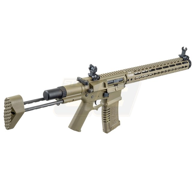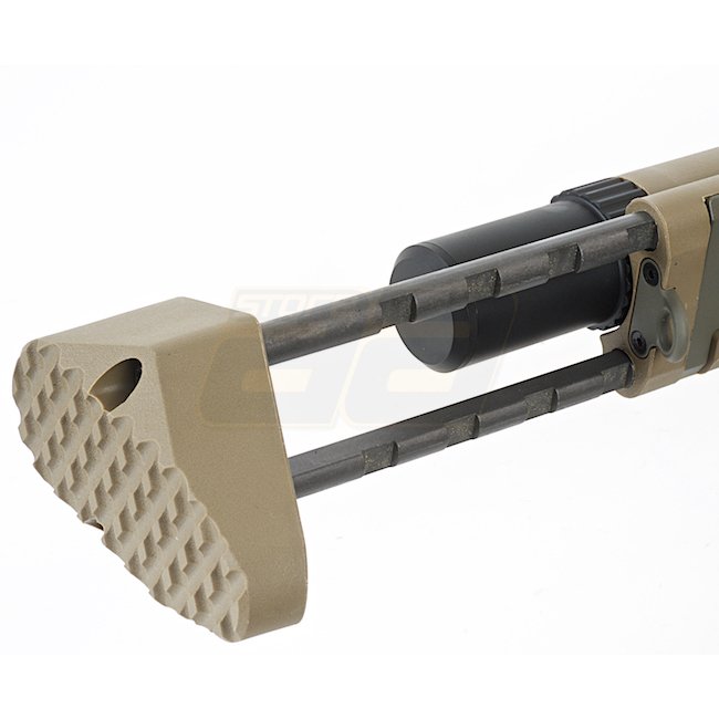 Während das Gehäuse aus modernem Polymer gefertigt ist, sind der Handschutz sowie die 20mm / Picatinny Schiene auf dem Gehäuse aus Metall. Auch alle Accessories wie Ladehebel, Verschlussfang, Magazinauswurf, Feuerwahlhebel und Abzug sind aus Metall, gleich wie die Führungen des ausziehbaren Schafts.