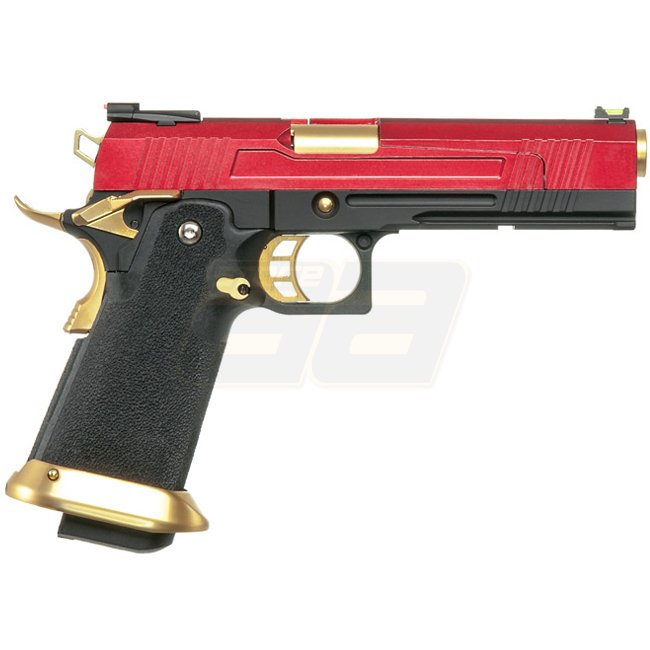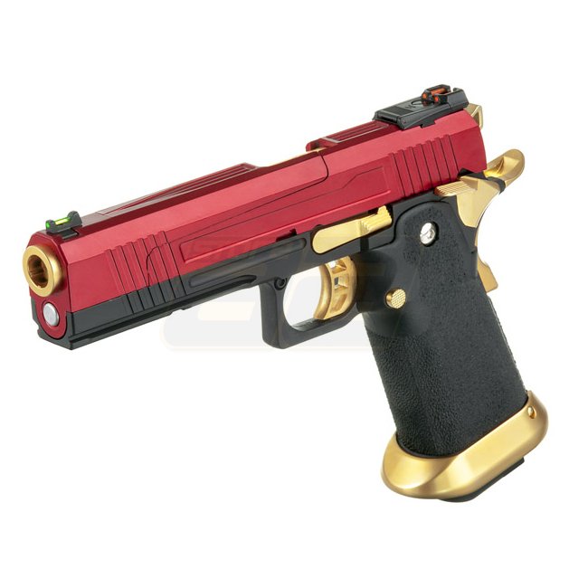 Schnellfeuer-Gas-Blow-Back-Pistole mit rotem Metall-Schlitten und -Rahmen, Kunststoffgriff, 30 Schuss Magazin Kapazität, 223 mm Länge, 1070 g Gewicht und 110 mm innere Lauf-Länge. Mündungsenergie von 280-300 FPS, halbautomatischer Schussmodus, einstellbar