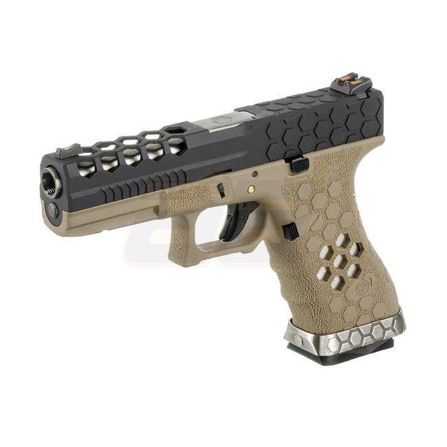 Die Hex Cut Serie hat ihren Namen von den hexagonalen Aussparungen am Schlitten sowie am Griffstück. Diese führen zu weniger Gewicht was gerade beim Schlitten zu einem schnelleren Repetieren führt. Dieser kommt ab Werk mit einem Fiber Optic Absehen ausgestattet; vorne in Grün, hinten in Orange. Der Aussenlauf verfügt über ein WE-Innengewinde von 11mm, womit Schalldämpfer oder Kompensatoren montiert werden können. Unter dem Schlitten findet sich zudem eine Schiene für das Anbringen von weiterem Zubehör. Der Abzugsbügel weist auf der Unterseite spezielle Fingerrillen auf. Diese helfen der Support Hand einen noch besser Halt zu finden, was entsprechend zu einer stabileren Schussabgabe und mehr Zielgenauigkeit führt. Das markant texturierte Griffstück sorgt für einen sehr guten Halt und weist ein interessantes Design-Element auf; Dank den auch hier vorhandenen hexagonalen Aussparungen erkennt man die Farbe des eingeführten Magazins, was der Pistole zusätzlich eine spezielle Optik verleit. Basierend auf der G-Serie, sind unter anderem auch die Magazine von WE kompatibel, wobei das mitgelieferte Magazin einen extra-grossen Magazinboden aufweist, was ein schnelleres und präziseres Nachladen ermöglichen soll.