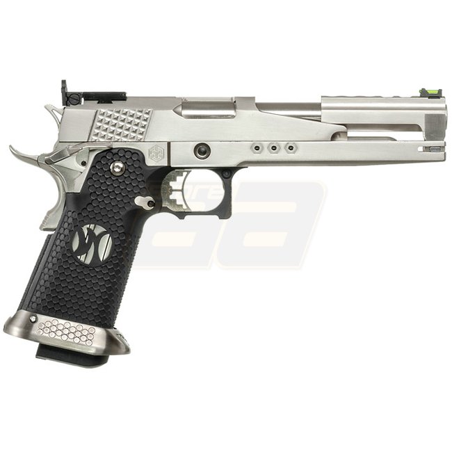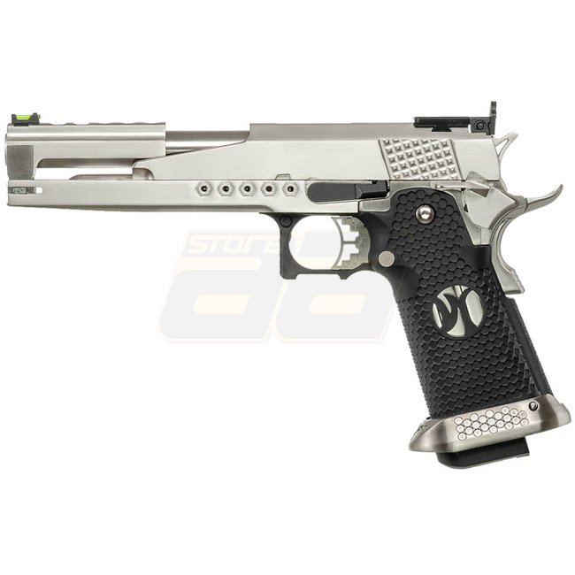 Die HX2201, so die offizielle Bezeichnung dieser Ausführung, lässt das Grundmodell einer Hi-Capa erkennen, weist jedoch ganz offensichtlich einen verlängerten Lauf und Schlitten auf. Beim Schiessen repetiert derweil nur der hintere Teil, der vordere Teil mit Korn und Kompensationsbohrungen ist fix. Das Korn ist übrigens mit einer Fiber Optic Einlage versehen, die Kimme besteht aus einem sogenannten Ghost Ring und sorgt für eine blitzschnelle Zielerfassung. Das aggressiv texturierte Griffstück garantiert einen optimalen Halt und weist ein interessantes Design-Element auf; Das Logo ist ausgeschnitten womit man das eingeführte Magazin bzw. dessen Farbe erkennt. Der Name “Dragon” wurde bei diesem Ungetüm von einer Pistole wohl sehr treffend gewählt…