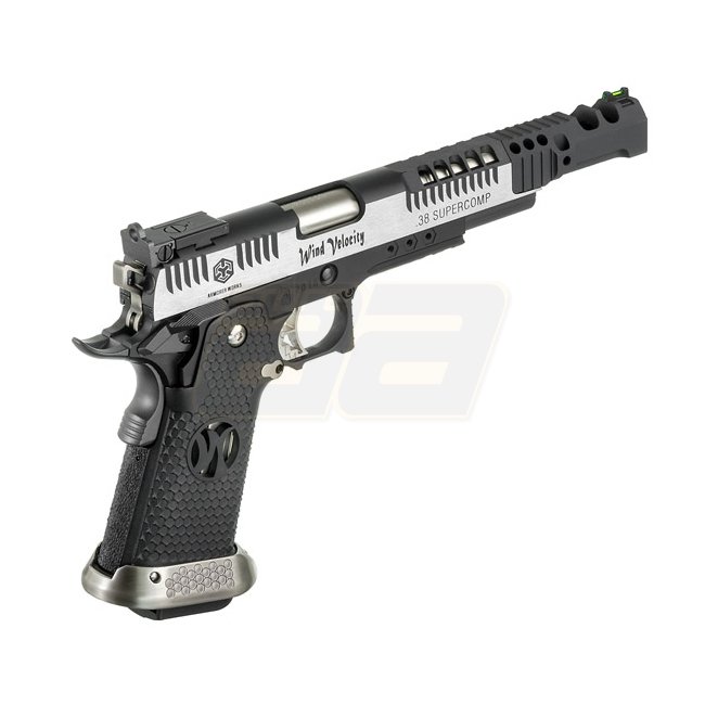 Die HX2401, so die offizielle Bezeichnung der .38 Supercomp Race Pistol Ausführung, lässt das Grundmodell einer Hi-Capa erkennen, weist jedoch ganz offensichtlich einen verlängerten Innenlauf von 166mm sowie einen feststehenden Kompensator auf. Beim Schiessen repetiert entsprechend nur der Schlitten, der Kompensator beibt fix. Das Korn ist übrigens mit einer Fiber Optic Einlage versehen, die Kimme besteht aus einem sogenannten Ghost Ring und sorgt für eine blitzschnelle Zielerfassung. Das aggressiv texturierte Griffstück garantiert einen optimalen Halt und weist ein interessantes Design-Element auf; Das Logo ist ausgeschnitten womit man das eingeführte Magazin bzw. dessen Farbe erkennt. Ein Detail das man schnell übersehen könnte sind die speziellen Fingerrillen an der Unterseite des Abzugsbügels. Diese helfen der Support Hand einen noch besser Halt zu finden, was entsprechend zu einer stabileren Schussabgabe und mehr Zielgenauigkeit führt, was aufgrund des knackigen Rückstosses durchaus willkommen ist.