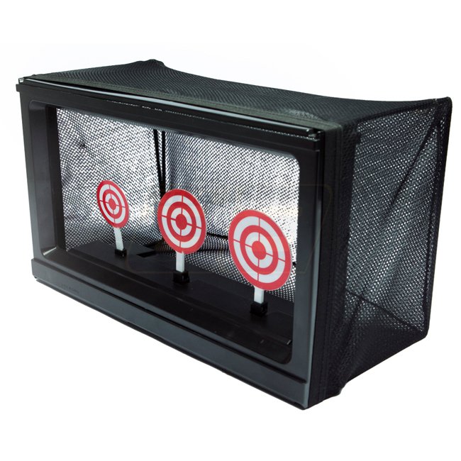 Rein mechanisch betätigt, keine Batterien erforderlich. Schiesse von rechts nach links auf die Ziele, wenn das letzte Ziel auf der linken Seite getroffen wird drehen sich alle drei Ziele wieder nach oben. Das Netz fängt alle BBs und ist leicht zu reinigen wenn das Zielschiessen vorüber ist.