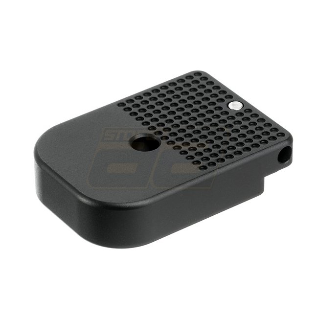 Eloxierter schwarzer Magazinboden für Marui Hi-Capa-Handfeuerwaffen. Langlebige Aluminiumkonstruktion mit Sicherheitsstift. 10x14 Dimpel-Anordnung für einfaches Markieren.