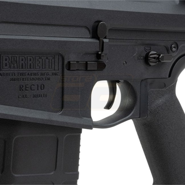 Das Gehäuse besteht aus robustem Polymer und ist mit originalgetreuen Barrett-Markings versehen. Die einteilige M-LOK-Handschutzlösung sowie die durchgehende 1913er Picatinny-Schiene bieten vielseitige Montagemöglichkeiten für Optiken und Zubehör.