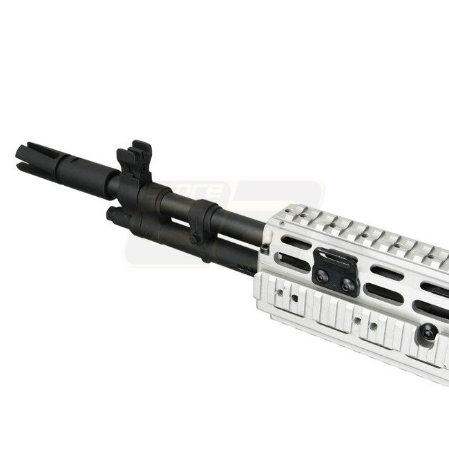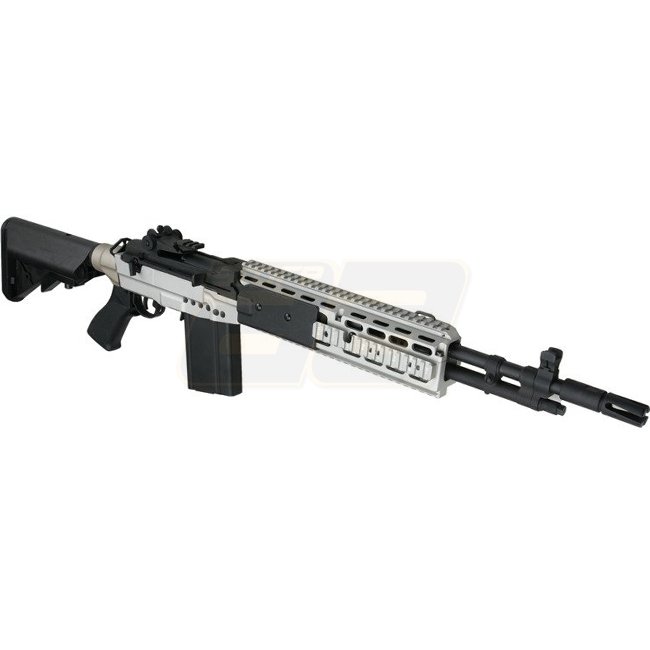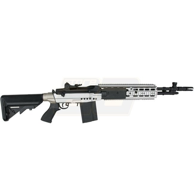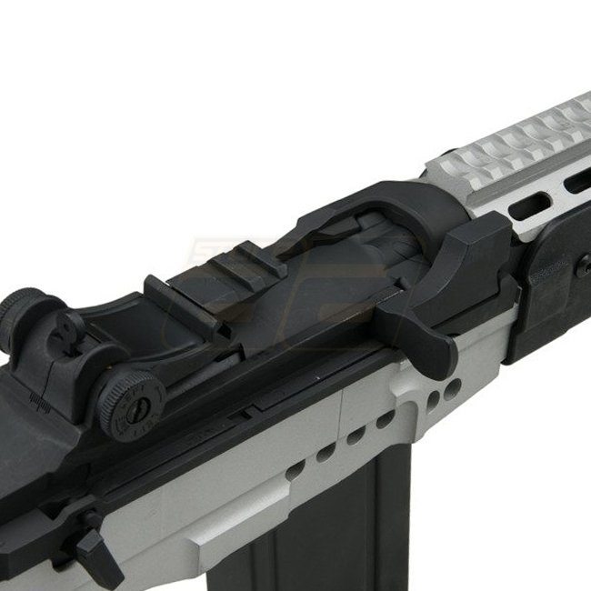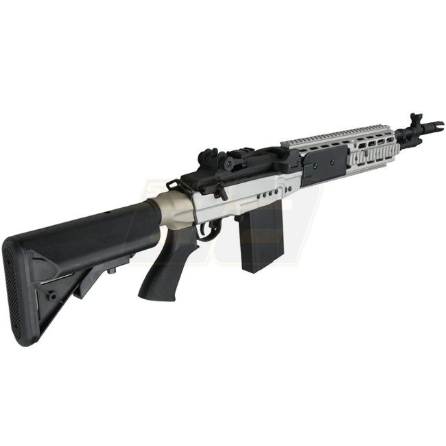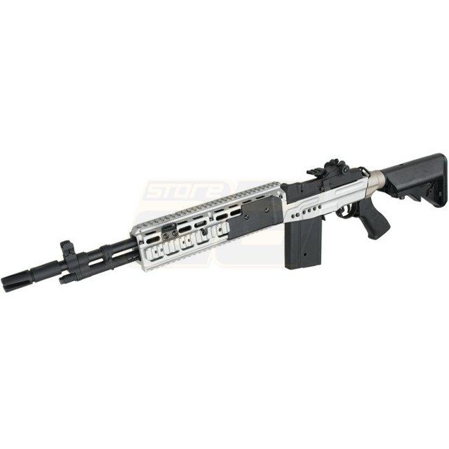 Die Cyma M14 EBR SF AEG in Silber ist eine leistungsstarke und vielseitige Airsoftwaffe, die sowohl im halbautomatischen als auch im vollautomatischen Modus schießen kann. Im Paket sind die Waffe und das Magazin enthalten.