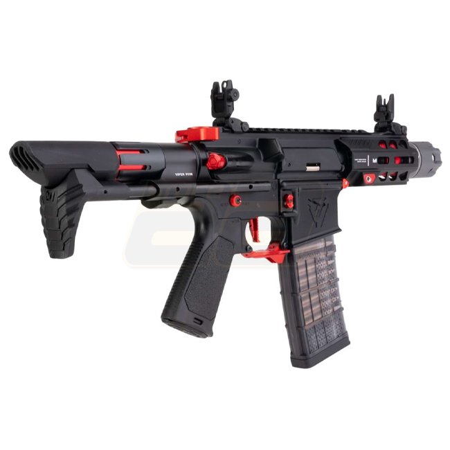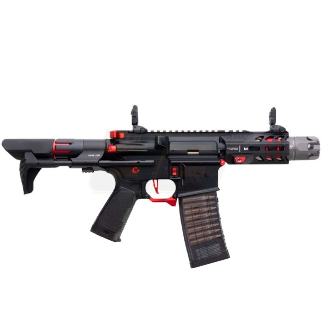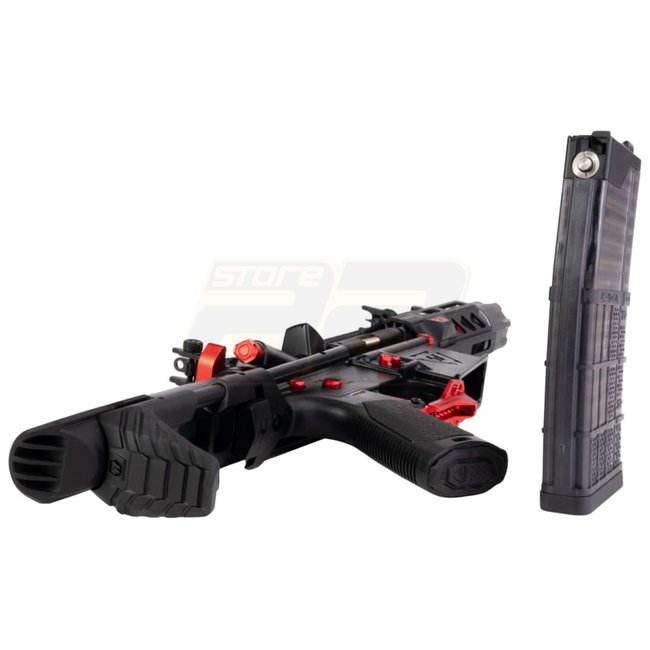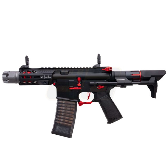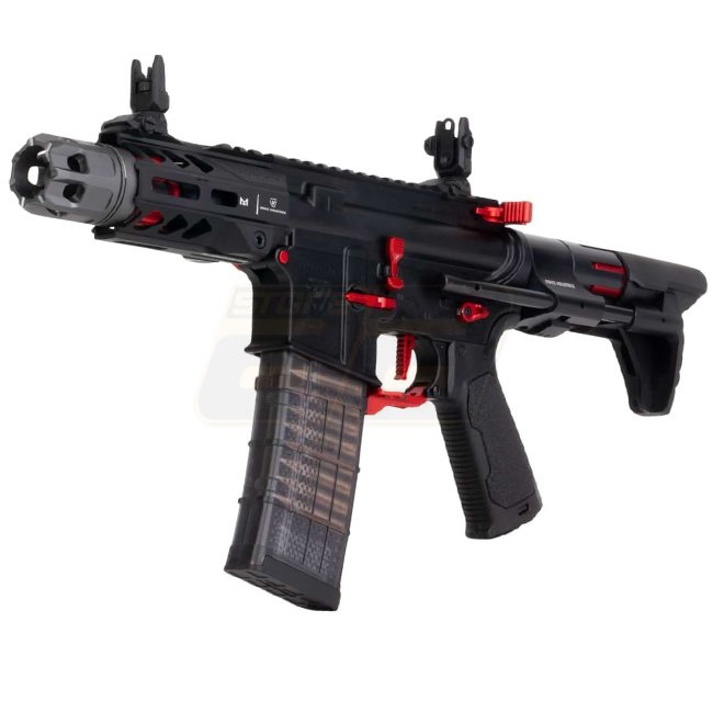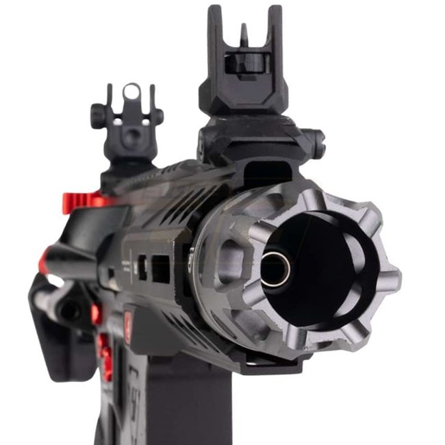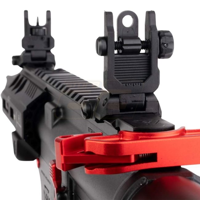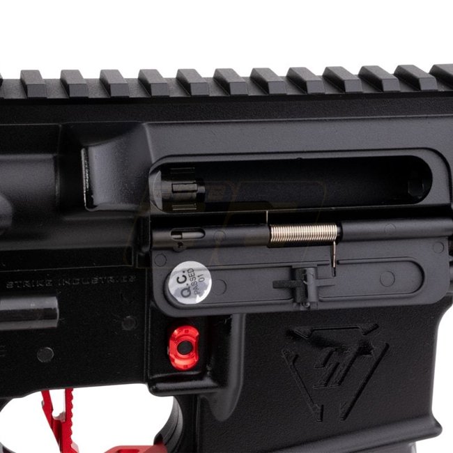 Cyma Strike Industries AR Strike Raider SBR Gas Blow Back Gewehr 4 Zoll - Schwarz / Rot ist ein vollständig lizenziertes AR-15, das mit Strike Industries-Ausrüstung wie dem SI 4-Zoll Gridlok Lite Handguard, dem SI Oppressor Mündungsgerät und mehr ausgesta