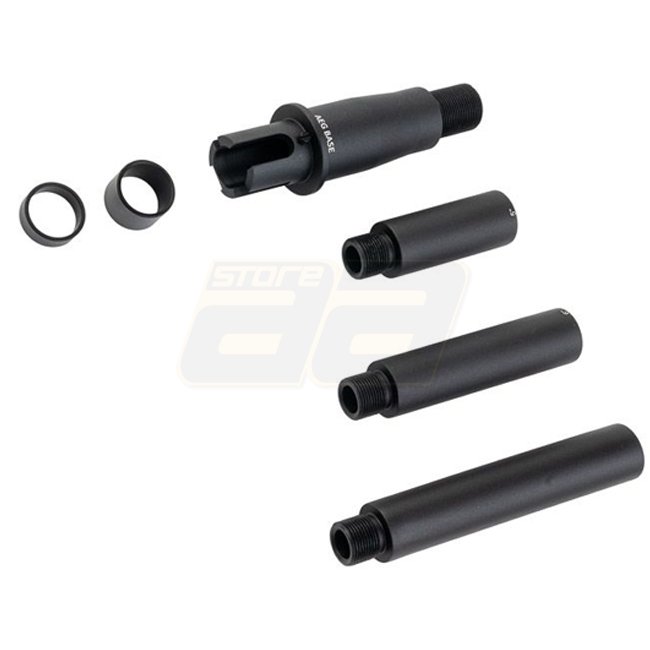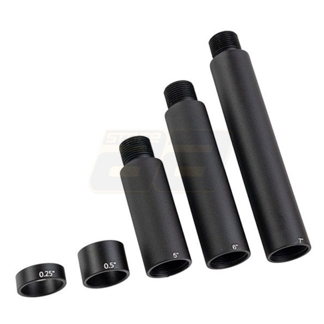 Dieses modulare Laufset ermöglicht die individuelle Anpassung der Lauflänge an Tokyo Marui AEGs. Komplett mit Kammerabschnitt, Spacer und drei Verlängerungen, für präzise Anpassung von 5 in bis 7,5 in. Alle Teile verfügen über 14 mm CCW‑Gewinde für Mündungsaufsatz.
