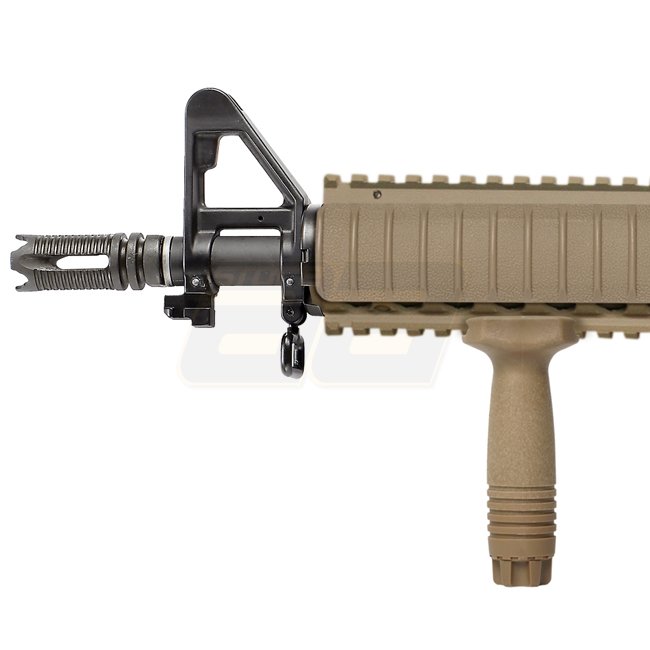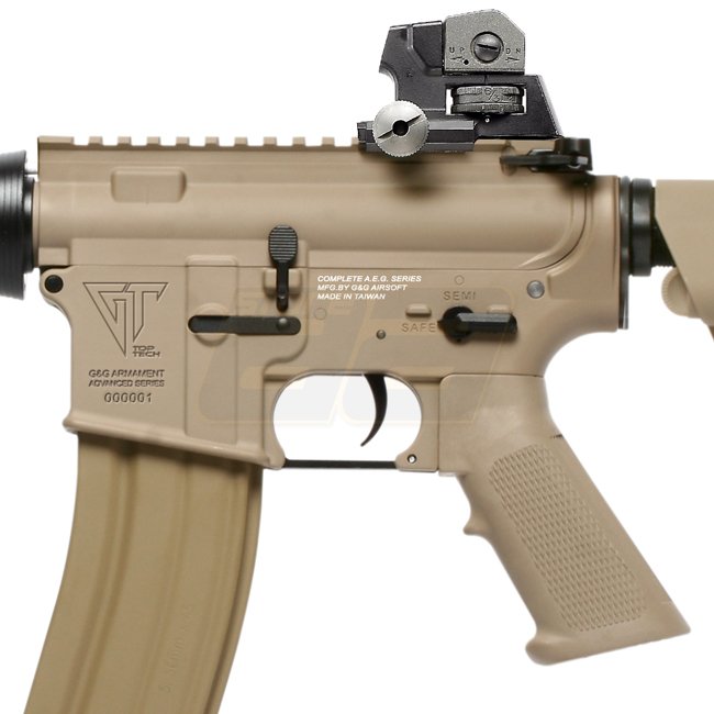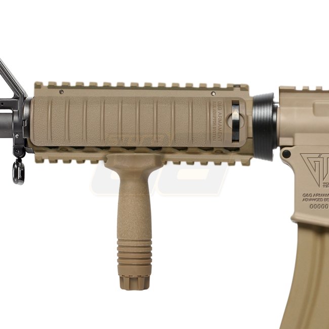 G&G TR4 CQB-R Desert AEG - Hochwertiges Airsoft-Gewehr aus Metall, 450 Schuss Magazin Kapazität, 700-795mm Länge und 3000g Gewicht. Verfügt über ein Version2-Getriebe, einen Langmotor und ein verstellbares Hop-Up für präzises Schießen. Wird mit einem 285m