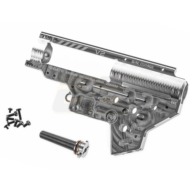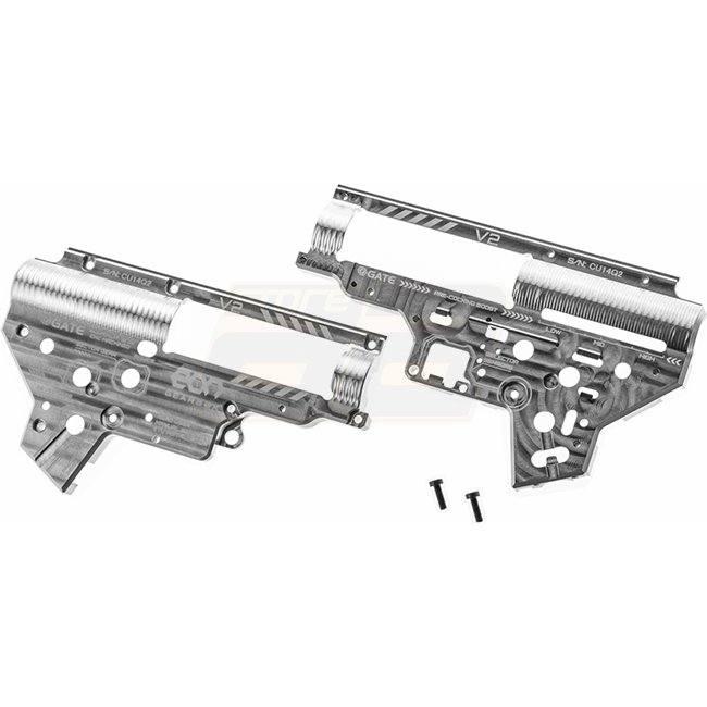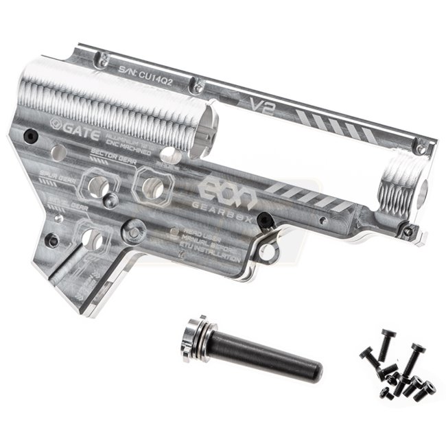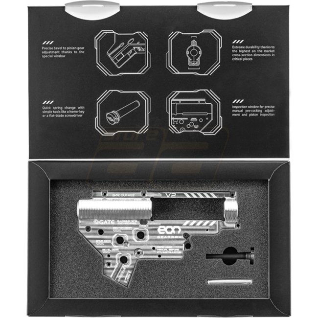 Verbessern Sie Ihr Airsoft-Spiel mit dem Gate EON V2 Gearbox in einem eleganten silbernen Design. Rüsten Sie Ihr Gewehr mit diesem zuverlässigen und langlebigen Getriebe für maximale Leistung auf dem Feld auf.