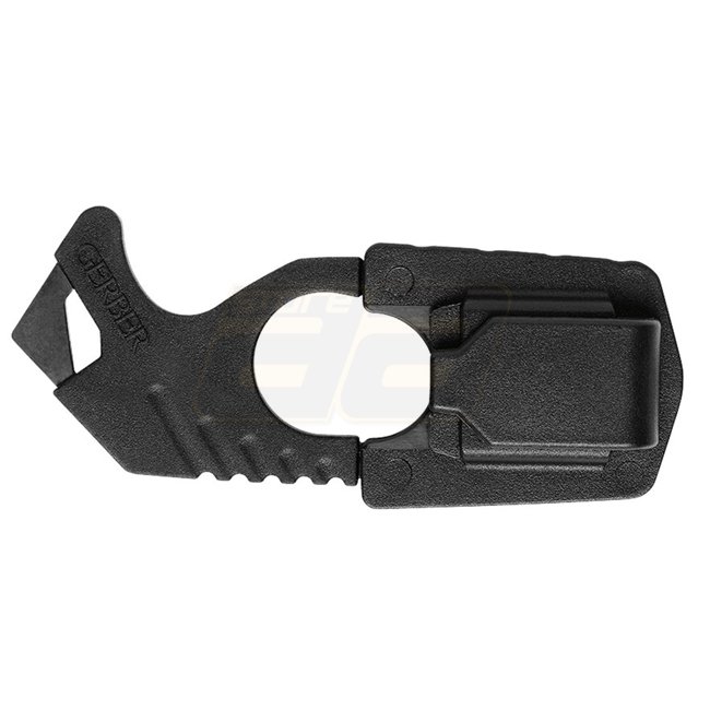 Gerber Strap Cutter - Schwarz: Nylonbänder, Sicherheitsgurte in Sekunden schneiden. Einseitige Klinge, Konstruktion aus Edelstahl mit schwarzer Oxidbeschichtung. Texturierte Rückenkante, Gummigriff, Glasbrecher, Fingerhaken, großes Fingerloch. Hergestellt