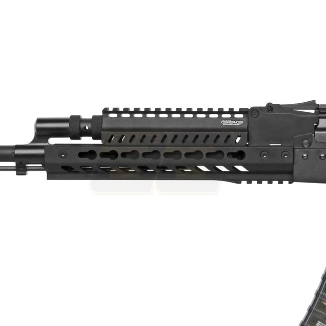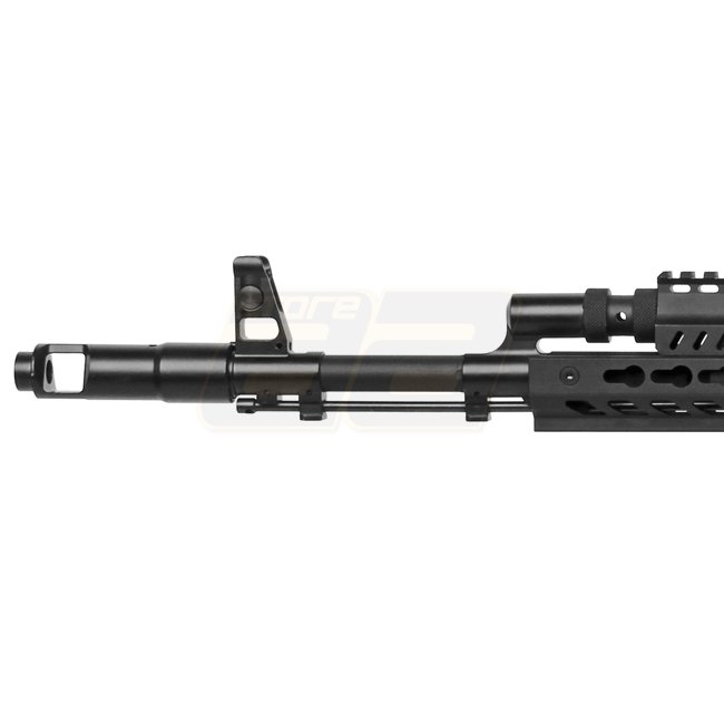 Bei der RK74 Serie von G&G wurden fortschrittlich-moderne Elemente mit der bewährten AK74 Basis vereint. So weist die Waffe einen auszieh- sowie seitlich klappbaren Schaft mit sechs Positionen und integriertem Batteriefach auf. Auf der Oberseite lässt sich eine Zielhilfen anbringen, am KeyMod-kompatiblen Handschutz dank der Schienen diverses weiteres Zubehör. Der vergrösserte Magazinhebel lässt das Wechseln der Magazine noch schneller geschehen; einfach erreichbar mit dem Abzugsfinger, dies während man mit der gleichen Hand fest den ergonomischen Pistolengriff umfasst. Der Feuerwahlhebel ist ebenfalls modernisiert und verfügt über zusätzliche Auflagepunkte die auch beim Tragen von Handschuhen für die nötige Kontrolle sorgen. Erreichbar ist dieser für Linkshänder direkt mit dem Daumen, für Rechtshänder mit dem Indexfinger. Der Ladehebel findet sich beidseitig, was man so eher selten sieht bei AK Modellen. Dies ermöglicht einen schnellen un einfachen beidseitigen Zugriff auf die im Verschluss befindliche Hop Up Unit und macht dieses Modell auch für Linkshänder eine Option.