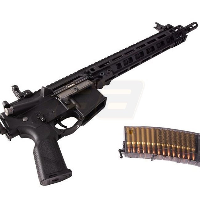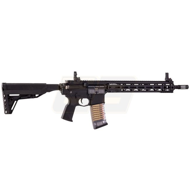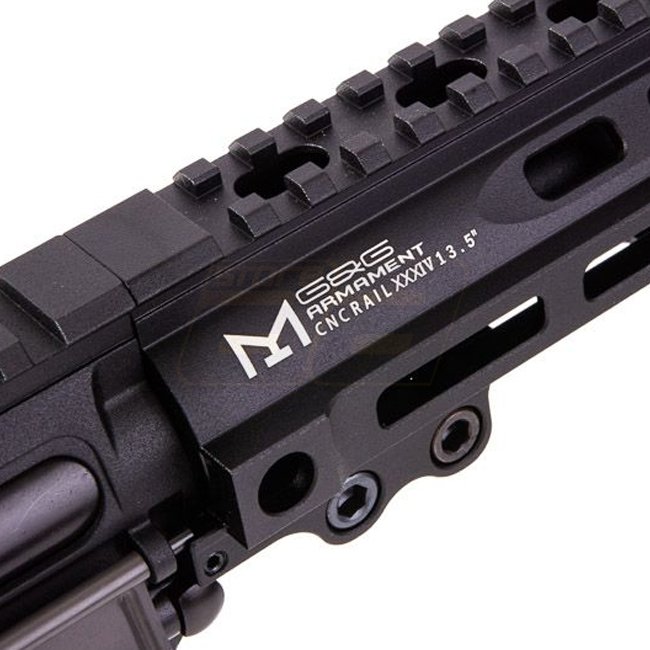 G&G TR16 GMS MK2 13,5 Zoll M4 AEG mit Version 2 Gearbox, MOSFET, G&G IFRIT 25K Motor, Polymer/M Metall-Material, 30 Schuss Magazin Kapazität, 825 mm Länge, 2950 g Gewicht. Mündungsenergie von 350-370 FPS, Schussereichweite von 48,02-50,76 m, halbautomatis
