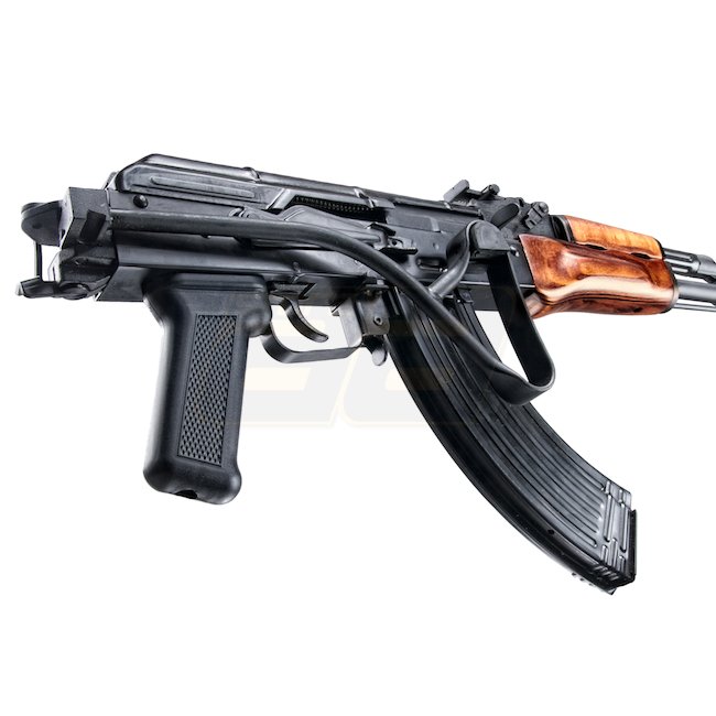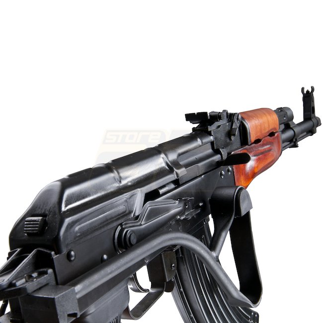 Hochwertiges GHK AIMS Gas Blow Back Gewehr mit Metallkonstruktion, Holzgriffstück und Kunststoffpistole. 40-Schuss-Magazin Kapazität, 671 / 909mm Länge und 3330g Gewicht. Ideal für Airsoft-Enthusiasten mit einer Mündungsgeschwindigkeit von 390-410 FPS. Se