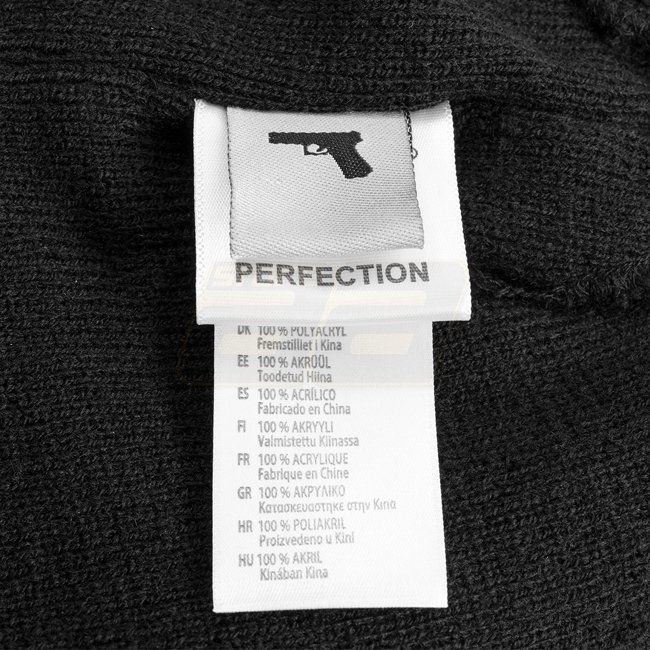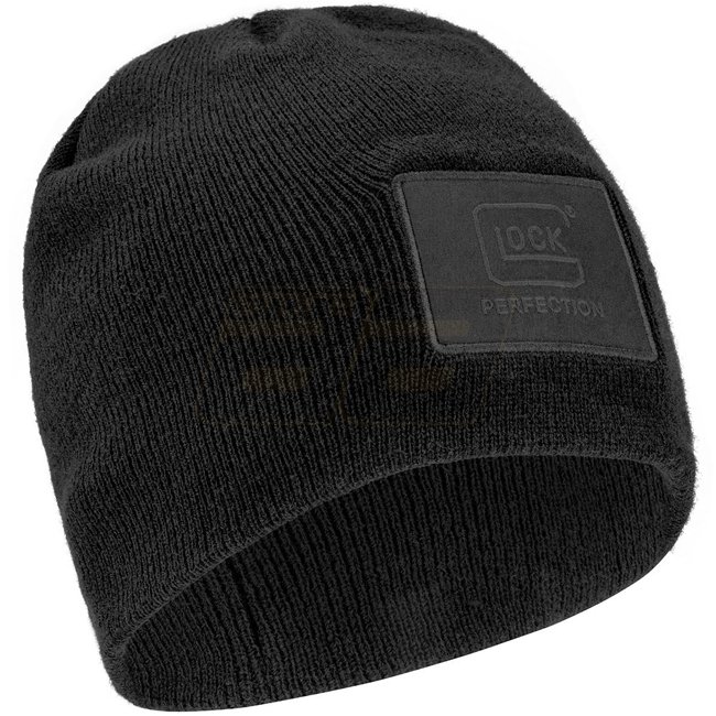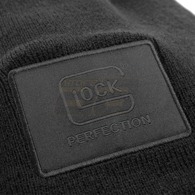 Glock Perfektion Beanie - Schwarz: Stilvolle schwarze Strickmütze aus 100% Polyacryl mit gesticktem Abzeichen und silbernem Flaggen-Detail.