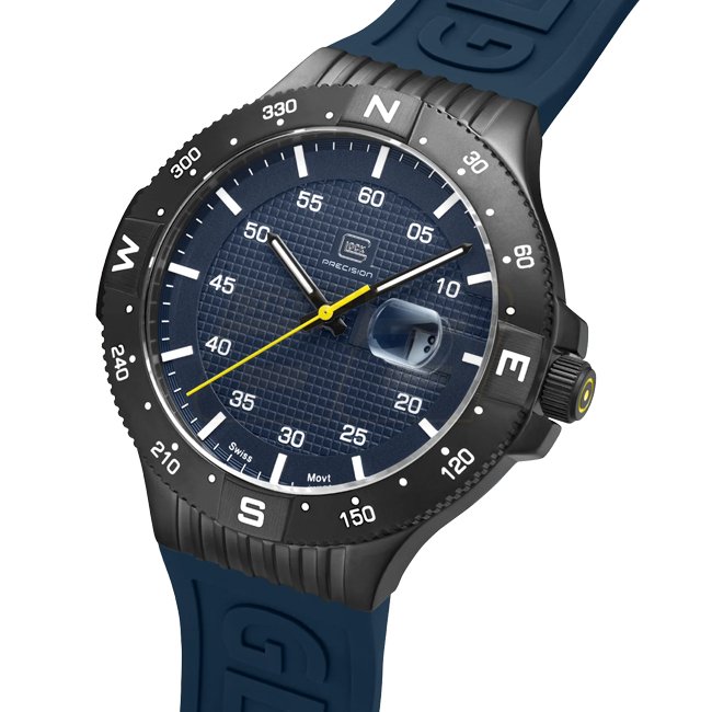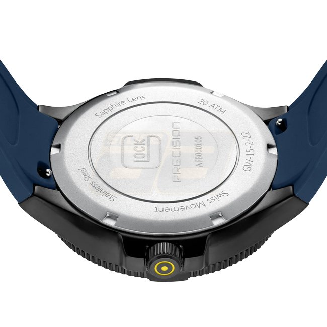 Eingefasst in ein sandgestrahltes Edelstahlgehäuse in Gunmetal-Finish, zeigt das blaue Zifferblatt Zeiger und Indizes mit Schweizer Super-LumiNova® sowie einen auffälligen gelben Sekundenzeiger. Ein blaues Silikonarmband mit GLOCK-Schriftzug umschließt das Handgelenk und verleiht der Uhr einen sportlichen Look. Angetrieben von einem Schweizer Uhrwerk und mit einer Wasserdichtigkeit von 20 ATM bewertet, steht diese Uhr für Langlebigkeit und Widerstandsfähigkeit.